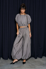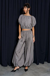 Брюки-джоггеры, выполнены из шелестящей плащевки. Характеристики: прямой крой, пояс на резинке, в боковых швах карманы, штанина внизу на резинке с фиксатором, без подклада. Длина по боковому шву 111,5 см.