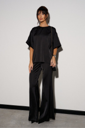 Брюки прямого свободного кроя. Выполнены из мягкой струящейся ткани чёрного цвета. Пояс на резинке. Карманов нет. Длина 109 см