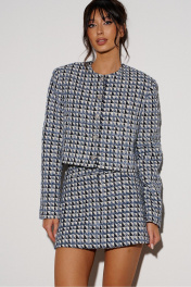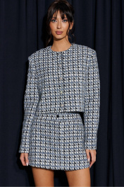 Юбка силуэт трапеция, выполнена из твидовой ткани. Характеристики: стабильный пояс, застежка центральная на петлю-пуговицу и потойную молнию. Брендированная подкладка. В боковых швах карманы. Длина по задней части изделия 35см.