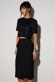 Юбка-миди. Выполнена из костюмной ткани чёрного цвета. С подкладкой. Прилегающий силуэт. Пояс стабильный. По боковым частям декоративные клапаны. Застёжка в среднем шве заднего полотна изделия - молния. Шлица из среднего шва заднего полотна (26 см). Длина по боковому шву 70 см
