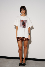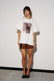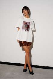Юбка прямого кроя выполнена из бархатного полотна светло-коричневого цвета с пайетками. Характеристики: прямой крой, подкладка, пояс на резинке. Длина 41 см.