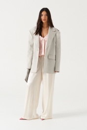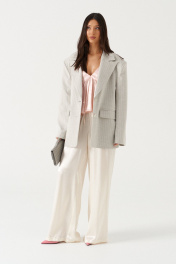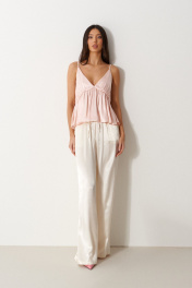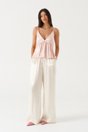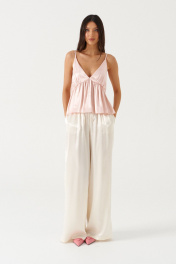 Брюки прямого свободного кроя, выполнены из текстильной струящейся ткани молочного цвета. Характеристика: прямой свободный крой, пояс на резинке и кулиске, в боковых швах карманы. Длина брюк по боковому шву 113 см.