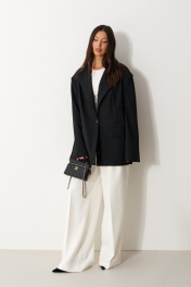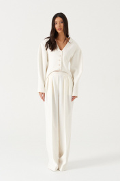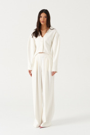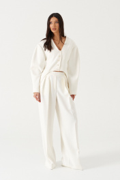 Брюки прямого свободного кроя с декоративными складками, выполнена из костюмной ткани молочного оттенка. Характеристики: прямой свободный крой, пояс частично на резинке(со спинки), в боковых швах косые карманы, по передней части изделия декоративные складки. Длина брюк по боковому шву 114 см.