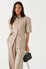 Брюки прямого кроя выполнены из текстильной тонкой ткани бежевого цвета в узкую полоску. Характеристики: прямой крой, пояс на широкой резинке, боковые карманы, на передних и задних частях брюк заутюжены стрелки, без подкладки. Длина брюк по боковому шву 112 см.