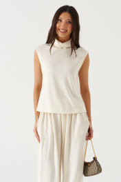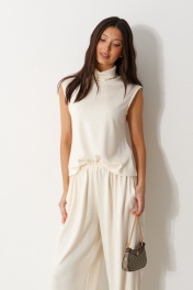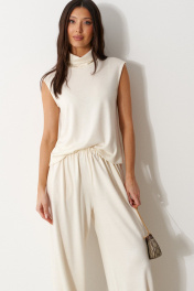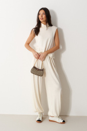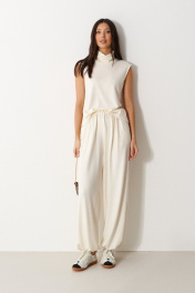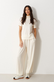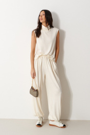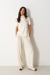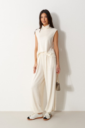 Брюки-джоггеры выполнены из трикотажного полотна молочного цвета. Характеристики: прямой крой, пояс на шнурке-резинке с фиксатором, в боковых швах карманы, штанина внизу на резинке с фиксатором. Длина 105 см.
