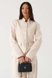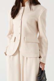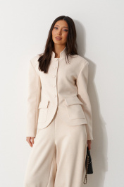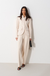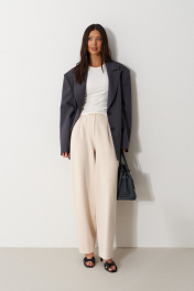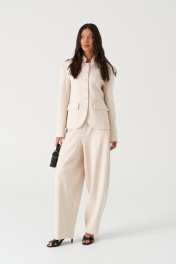 Брюки свободного кроя. Выполнены из плотного трикотажа бежевого цвета. Без подкладки. Пояс на резинке. В боковых швах карманы. По задней части накладные карманы. Брюки заужены к низу. Длина бокового шва 105 см