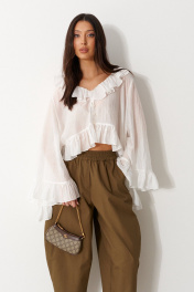 Брюки свободного кроя, зауженные к низу, выполнены из хлопкового полотна коричневого цвета. Характеристика: свободный крой, брючины заужаются к низу, пояс на резинке, имитация гульфика, в боковых швах карманы. Длина по боковому шву 94 см.
