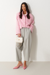 Брюки свободного кроя, зауженные к низу, выполнены из хлопкового полотна серого цвета . Характеристика: свободный крой, брючины заужаются к низу, пояс на резинке, имитация гульфика, в боковых швах карманы. Длина по боковому шву 94 см.