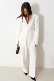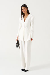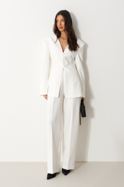 Брюки длинные, прямого силуэта, широкие. Выполнены из костюмной ткани белого цвета. Характеристика: По переду и спинке заутюжены канты. Пояс широкий притачной на резинке, с отделочными строчками. На передних частях брюк обработаны карманы с отрезным бочком. Длина брюк по боковому шву 112 см.