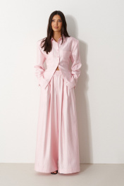 Брюки прямого свободного кроя. Выполнены из текстильного полотна нежно-розового цвета с мягким блеском. Без подкладки. Пояс на резинке. По переду имитация застёжки. Наклонные карманы. Длина бокового шва (с учетом пояса) 110 см