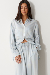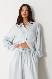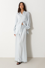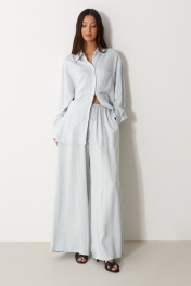 Брюки свободного кроя. Выполнены из мягкой струящейся ткани голубого цвета с белой полоской. Пояс на резинке, со шнурочком. В боковых швах карманы. Длина бокового шва (с учётом пояса) 107 см