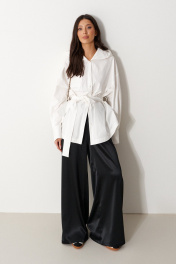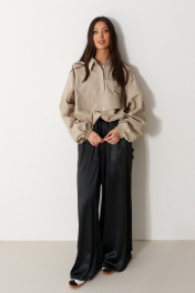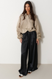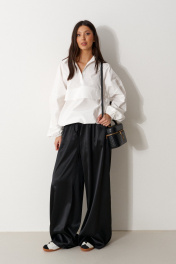 Брюки свободного кроя. Выполнены из мягкой струящейся ткани чёрного цвета. Пояс на резинке, со шнурочком. В боковых швах карманы. Длина бокового шва (с учётом пояса) 107 см