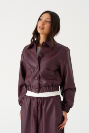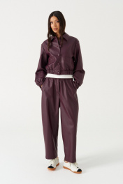 Брюки прямого кроя, выполнены из фактурной эко-кожи бордового цвета. Характеристика: прямой крой, пояс на резинке, спереди есть имитация гульфика, без подкладки, в боковых швах карманы. Длина изделия по боковому шву 96 см.