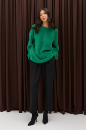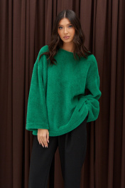 Джемпер прямого свободного кроя, выполнен из мягкой фактурной ткани зеленого цвета. Характеристики: прямой крой, овальный вырез горловины, рукав свободного кроя спущен. Длина по спинке 68 см, длина рукава от края горловины 69 см.
