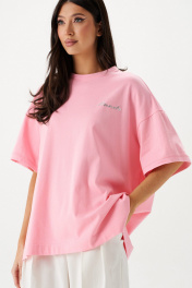 Футболка прямого свободного кроя, выполнена из хлопкового полотна розового цвета. Характеристики: прямой свободный крой, горловина овальная, рукав слегка спущен, горловина и край рукава выполнены из довяза, по передней части изделия слева декоративная объемная печать "Annete". Длина по центру спинки 69 см, длина рукава 18 см.