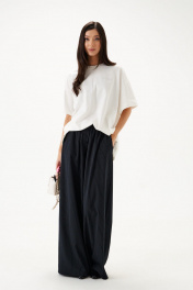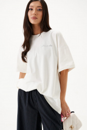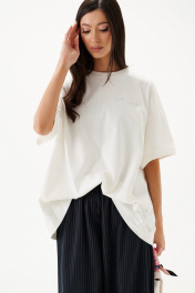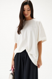 Футболка прямого свободного кроя, выполнена из хлопкового полотна белого цвета. Характеристики: прямой свободный крой, горловина овальная, рукав слегка спущен, горловина и край рукава выполнены из довяза, по передней части изделия слева декоративная объемная печать "Annete". Длина по центру спинки 69 см, длина рукава 18 см.