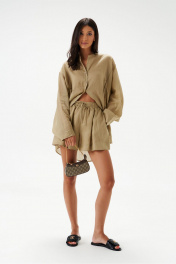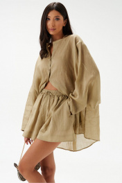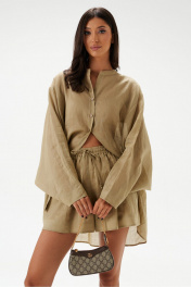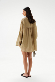 Рубашка свободного кроя выполнена из натурального полотна рами. Характеристики: рубашка прямого свободного кроя, горловина стойка. Застежка центральная на петли пуговицы, рукав акцентный объёмный, крой рукава «летучая мышь» , спинка отрезная с декоративной сборкой. Длина по спинке 80 см, длина рукава от горловины 76 см.