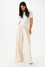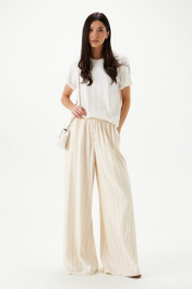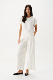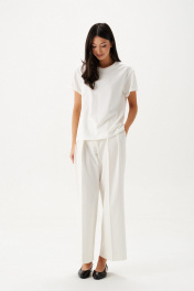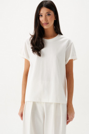 Футболка прямого кроя, выполнена из плотна белого цвета.Характеристики: прямой крой, овальный вырез горловины, горловина выполнена из довяза, рукав слегка спущен, край рукава подвернут. Длина по спинке от края горловины 59 см, длина рукава от края горловины 27 см.