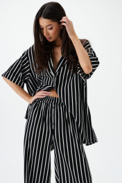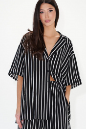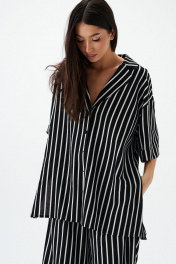 Блузка прямого свободного кроя выполнена из текстильной черного полотна в белую полоску . Характеристики: отложной воротник, застежка центральная на петли пуговицы, спущенная линия плеча, по бокам изделия разрезы 30см, рукав кароткий прямого кроя. Длина рубашки 74 см, длина рукава от края горловины 47см.
