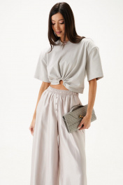 Футболка прямого кроя, выполнена из хлопкового полотна серого цвета. Характеристика: укороченая, прямой свободный крой, горловина овальная, рукав слегка спущен, подплечники, спереди декоративная сборка на элемент-полукольцо . Длина по центру спинки от края горловины 40 см, длина рукава от края горловины 39 см.