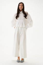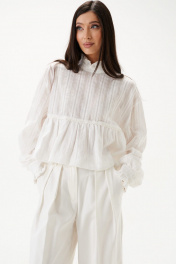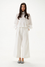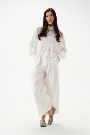 Блуза свободного кроя, силуэт "трапеция". Выполнена из хлопкового полотна. Воротник-стойка с рюшей по верхнему срезу. По стороне спинки разрез с застежкой на навесную петлю и пришивную пуговицу. Линия плеча спущенная. Рукав втачной, с манжетой с рюшей, застегивающаяся на пуговицы. Верхняя часть лифа со средним швом по спинке. Нижняя часть блузки-рюша с мягким подгибом по низу. Длина рукава 60 см. Длина спинки 52 см