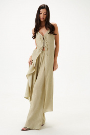 Длинная блузка полуприлегающего силуэта, на бретелях. По груди нагрудные вытачки. Лиф блузона на подкладке. Бретели узкие на регуляторах. Застежка центральная на шнурки-завязки. Длина по спинке 113см.