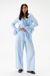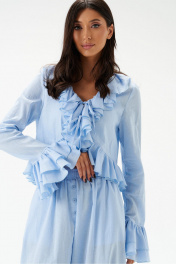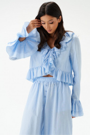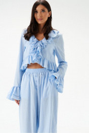 Блузка из хлопкового полотна голубого цвета, свободного облегания, укороченная.Горловина V-образная, с притачной рюшей по всей длине горловины, борта и низа. Застежка на шнурки- завязки.Рукав одношовный, длинный заканчивающийся притачной манжетой, состоящей из двух рядов воланов.Длина по спинке 48см, длина рукава 68см.