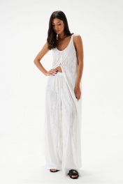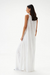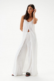 Блузон длины макси выполнен из трикотажного полотна полупрозрачного светлого цвета. Силуэт свободный. Без подкладки. Застёгивается от груди на ряд пуговиц. Длина по спинке 139см.