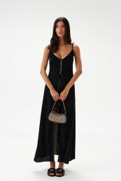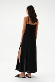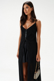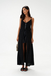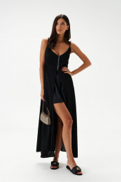 Блузон длины макси выполнен из полупрозрачного фактурного полотна черного цвета. Силуэт свободный. Бретели нерегулируемые. Лиф фигурный, двойной, по бокам выточки. Без подкладки. Застёгивается от груди на ряд пуговиц. Вырез в боковом шве 75 см. Длина по спинке 112 см.
