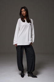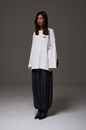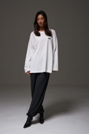 Джемпер прямого свободного кроя,выполнен из трикотажного полотна белого цвета. Характеристики: прямой крой, овальный вырез горловины, спинка цельнокроеная, по переду брендированная нашивка. Рукав длинный спущен. Длина по спинке 73 см, длина рукава от края горловины 78см.