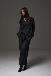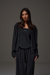 Топ прямого кроя с открытыми плечами, выполнен из трикотажного ворсистого полотна графитового цвета. Характеристика: прямой крой, верх изделия по передней и задней части на резинке, спереди брендированная нашивка. Длина по передней части 39 см, по задней части 35 см.