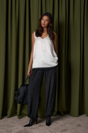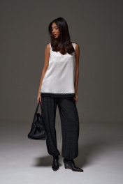 Блузон в крое трапеция, выполнен из струящейся ткани молочного цвета. Характеристика: крой трапеция - расширяется к низу, широкие бретели, спереди v-образный вырез, по спинке овальная горловины, спинка изделия чуть удлиненна, по низу изделия черное кружево. Длина изделия по центру спинки 64см ( с учетом кружева).