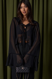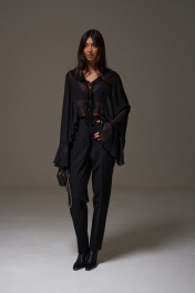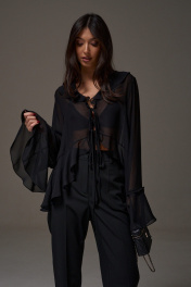 Блуза свободного кроя. Выполнена из мягкого прозрачного полотна чёрного цвета. Вырез горловины V-образный, с воланом по всей длине (переходит на спинку). Рукав втачной, спущенный, по низу волан с кулиской. Низ блузы по переду фигурный с воланом, волан переходит на спинку. Застёжка центральная - завязки. Длина рукава от линии втачивания 72 см. Длина спинки 71 см
