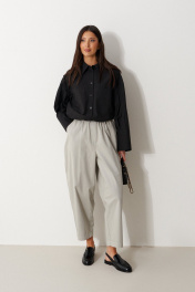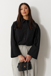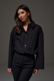 Рубашка прямого свободного кроя выполнена из хлопкового полотная черного цвета. Характеристики: прямой крой, отложной воротник на стойке, застежка центральная на петли пуговицы, по переду крупные карманы, рукав спущен, по рукаву декоративные складки, по низу рукава широкая манжета, спинка отрезная, низ изделия на резинке с фиксатором. Длина по спинке 55 см, длина рукава от края горловины 71 см.