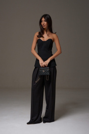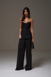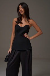 Корсет с фигурным вырезом выполнен из костюмного полотна черного цвета. Характеристики: прилегающий силуэт, подкладка, фигурный вырез горловины, по передней части изделия и в боковых швах упругие узкие пластины, по заднему полотну в среднем шве потайная молния. Длина по центру спинки 41см.