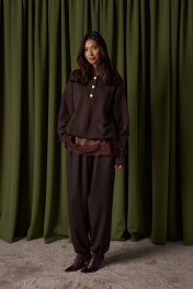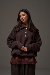 Джемпер свободного кроя. Выполнен из плотного трикотажного полотна шоколадного цвета. Воротник отложной. Застёжка центральная - акцентные пуговицы. Рукав спущенный, с манжетой. Низ изделия на резинке, регулируется. Длина рукава от линии втачивания 59 см. Длина спинки 70 см