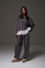 Джемпер в крое трапеция, выполнен из трикотажного полотна серого цвета. Характеристика: крой трапеция - расширяется к низу, овальная горловина, рукав спущен, спинка изделия чуть удлинена, по низу изделия пришита рюша из струящейся ткани с кружевом. Длина изделия по центру спинки 67 см ( с учетом кружева), длина рукава от края горловины 73 см.