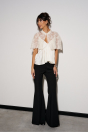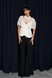 Кейп выполнен из кружевного сатинового полотна молочного цвета. Характеристики: горловина стойка, застежка центральная на пуговицу. Длина по спинке 36см.