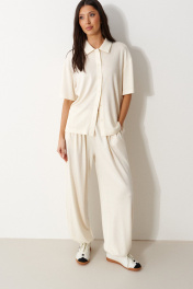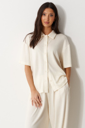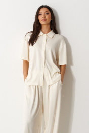 Джемпер свободного кроя, выполнен из трикотажного полотна молочного цвета. Характеристика: воротник вточной отложной, центральная застежка на петли-пуговицы, чуть спущенное плечо, рукав втачной, короткий. Длина по центру спинки 63см. Длина рукава от края горловины 41см.