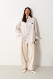 Рубашка прямого свободного кроя, выполнена из полотна молочного цвета в черно-оранжевую полоску. Характеристика: воротник отложной, застёжка центральная на пуговицы, по переду справа на уровне линии груди накладной карман, слева - брендированная нашивка Annete, рукав спущенный свободный, с широкой манжетой на пуговице, спинка отрезная с скоалками. Длина рукава от края горловины 78 см. Длин по центру спинки от края горловины 77 см.