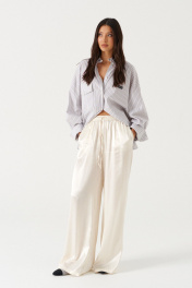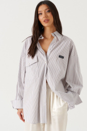 Рубашка прямого свободного кроя, выполнена из полотна белого цвета в сине-коричневую полоску. Характеристика: воротник отложной, застёжка центральная на пуговицы, по переду справа на уровне линии груди накладной карман, слева - брендированная нашивка Annete, рукав спущенный свободный, с широкой манжетой на пуговице, спинка отрезная с скоалками. Длина рукава от края горловины 78 см. Длин по центру спинки от края горловины 77 см.
