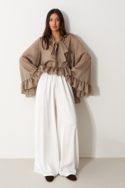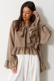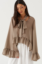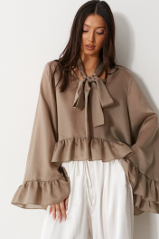 Блуза свободного кроя. Выполнена из мягкой полупрозрачной ткани в цвете хаки. Вырез горловины V-образный. Вырез декорирован бантом. Рукав втачной, спущенный. Рукав и низ изделия с воланом. Длина рукава от линии втачивания 71 см. Длина спинки 80 см