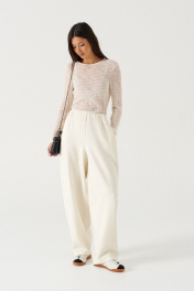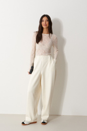 Джемпер прилегающего силуэта. Выполнен из кружевного полотна цвета шампанского. Характеристика: горловина обработана косой бейкой. Рукав одношовный втачной. Низ рукава и низ изделия обработаны в подгибку с открытым срезом. Длина рукава 68 см, длина джемпера по спинке 58 см.
