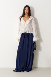 Блузка свободного кроя. Выполнена из мягкого полупрозрачного полотна белого цвета. Вырез горловины V-образный, с воланом по всей длине (переходит на спинку). Рукав втачной, свободный, по низу нашит волан. Низ блузы по переду фигурный с воланом, волан переходит на спинку. Спинка удлиненная. Застёжка центральная на петли-пуговицы . Длина рукава от линии втачивания 57 см. Длина спинки 76 см