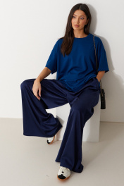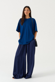 Футболка прямого свободного кроя, выполнена из хлопкового полотна глубокого синего цвета. Характеристики: прямой свободный крой, горловина овальная, край выполнен из довяза, рукав слегка спущен, по центру спинки изделия, под горловиной брендированная нашивка "Annete". Длина по центру спинки 69 см, длина рукава от края горловины 41см.