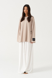 Джемпер прямого свободного кроя,выполнен из ткани бежевого цвета. Характеристики: прямой крой, овальный вырез горловины, спинка цельнокроеная, спущенное плечо, рукав вточной широкий, на левом рукаве брендированная нашивка "Annete". Длина изделия по центру по спинки 75 см, длина рукава от края горловины 70см.