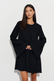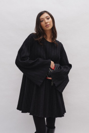 Платье свободного кроя выполнено из фактурного полотна черного цвета. Характеристики: А-образный силуэт, горловина овальная, застежка пуговичка петля по спинке изделия, рукав втачной с разведением к низу, низ изделия и низ рукава обработаны ролевым швом. Длина по спинке 84 см, длина рукава 69 см.