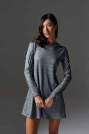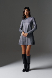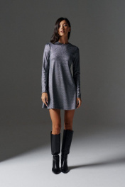 Платье полуприлегающего силуэта выполнено из полотна с люрексовой нитью. Характеристики: полуприлегающий силуэт, овальная горловина , рукав втачной, застежки в изделии нет. Длина 82 см, длина рукава 62 см.