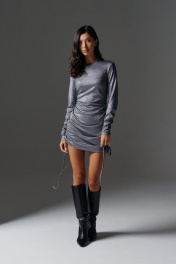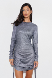 Платье прилегающего силуэта выполнено из полотна с люрексовой нитьюХарактеристики: прилегающий силуэт, горловина овальная, рукав втачной, в боковых швах декоративные шнуры для драпировки изделия. Длина по спинке 92 см, длина рукава 69 см.