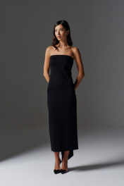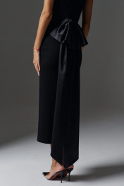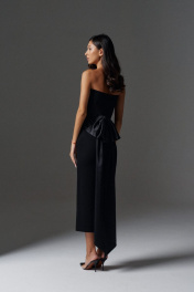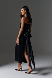Элегантное платье с открытыми плечами прилегающего силуэта с акцентным бантом по спинке выполнено из трикотажного полотна черного цвета. Характеристики: прилегающий силуэт, открытые плечи, по заднему полотну крупный не съёмный бант с лентами. В среднем шве заднего полотна изделия разрез 51 см. Длина по спинке 112 см.